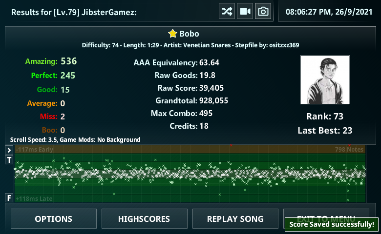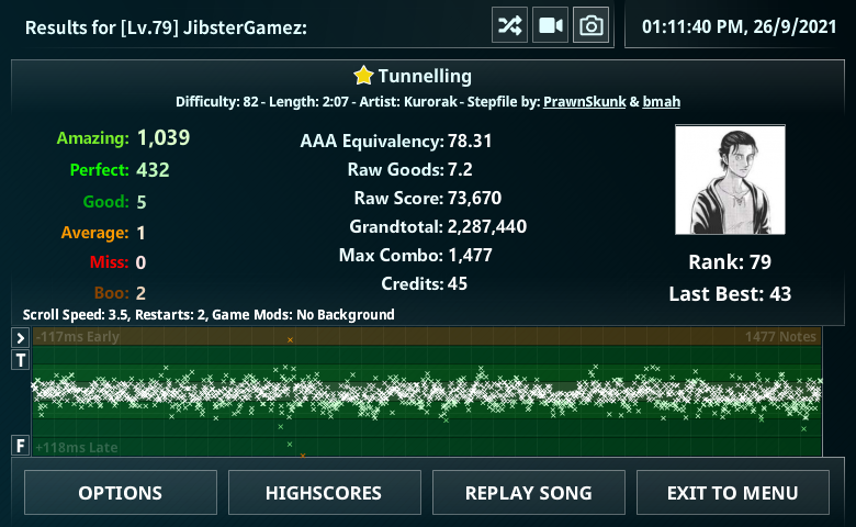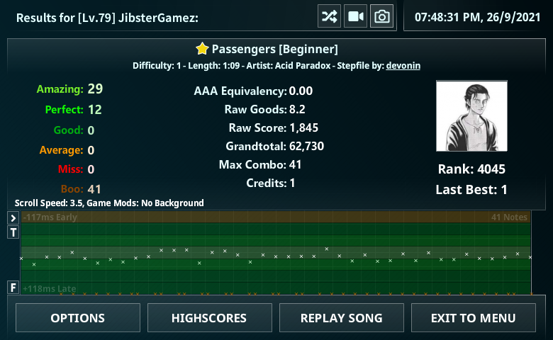 D1: 43 D2: 50 D3: 69 D4: 78 D5: 85 D6: 94 D7: 99-100 Bonus 1: Guess I'm Good at this Game Get a BBB (all "Good" judgments and nothing else) on any song. Reward: 2,500 credits. Top 5 good counts will get 2,500 more credits. Bonus 2: We're a Competitively Friendly Bunch Play 3 different songs on Multiplayer against any player currently in the tournament or myself. Both players must pass each song. You must post the results of each song with the MP window showing who your opponent was. No restrictions on song selection or rates used. Reward: 2,000 credits This Round ends on Friday, October 1st at 11:59 PM EST. |