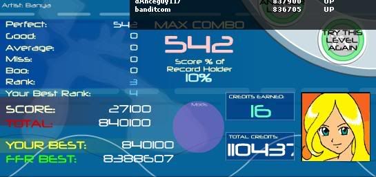 AAA # 46 ![]() missed end trill :/ shoulda had 250 again! ![]() 12 songs left over 500 rank (mashing songs are so gay) 535 Exciting Hyper Highspeed Star 442,340 584 Flight of the Bumblebee 525,715 591 Uber Rave 992,465 606 Beethoven Virus 700,715 610 Chrono Trigger - Boss Theme 521,385 638 Balloon Fever 502,280 691 Delirium 1,198,370 692 Lovely Lovely Lovely 643,765 694 Party 4u - HolyNightRemix V2 553,500 GONE! 739 CIA Rave 1,597,710 958 RunnyMorning (SGX MIX) 704,870 1,102 Silence 807,450 *Edit* ![]() make that 11 Average: 182.25531914894
