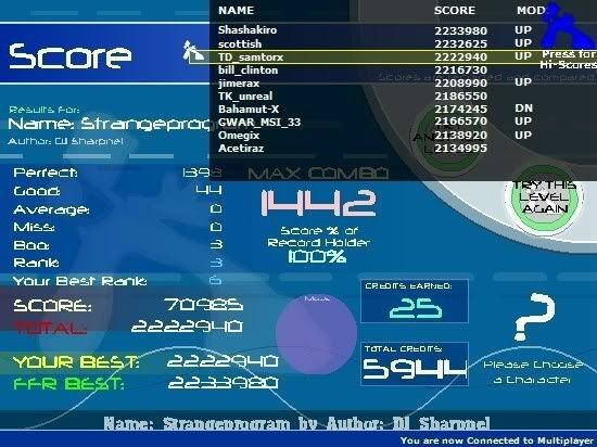![]() Ohh, heres another thing that I just found interesting... picks Member for: 1.17 years Location: FFR Overall Rank: 141267 Last 10 games played: Flight of the Bumblebee 1,336,100 23 hours ago Flight of the Bumblebee 506,385 23 hours ago Flight of the Bumblebee 0 23 hours ago One Minute Waltz 1,062,470 23 hours ago One Minute Waltz 76,075 23 hours ago Exciting Hyper Highspeed Star 52,050 23 hours ago Exciting Hyper Highspeed Star 31,895 23 hours ago Exciting Hyper Highspeed Star 1,890 23 hours ago Cutting Circles 9,275 23 hours ago ROFL Getting that on OMW and a AAA Fotbb in the last day. LMAO. Last edited by scottish; 10-8-2006 at 07:12 PM.. |
