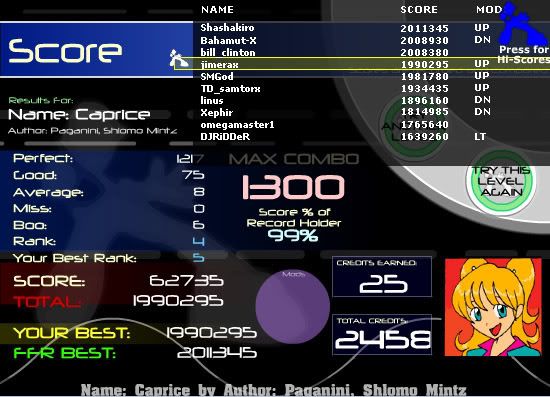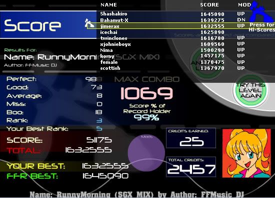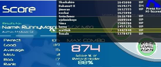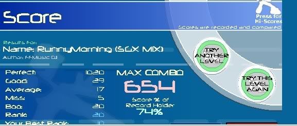 Heh, keep messing up, random places everytime... I'll hit the upjack EVERY time I dont hit the long jack, and vice-versa. I'll hit the FC soon too.. ![]() Thats from the long jack FC...decent PA, terrible with avg's and boos because the long jack I cover two arrows with my right hand, meaning I'm also jacking the down arrow at the same time..don't know why. |