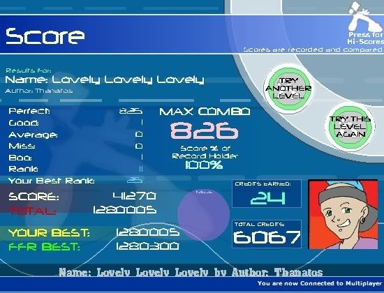 I have the BF on Hyper Pressure too ![]() EDIT - Just got this. My heart has never beat so hard in FFR lol, so I'm considering this my best score. Previous best was 9. (or maybe 11 can't remember) ![]() By the way, who is pinoy? EDIT 2 - You made me wanna try ASB dore. No AAA lol, but a small improvement. Previous best was 15-0-0-0-4 ![]() Last edited by kiki~; 11-10-2006 at 07:07 AM.. |