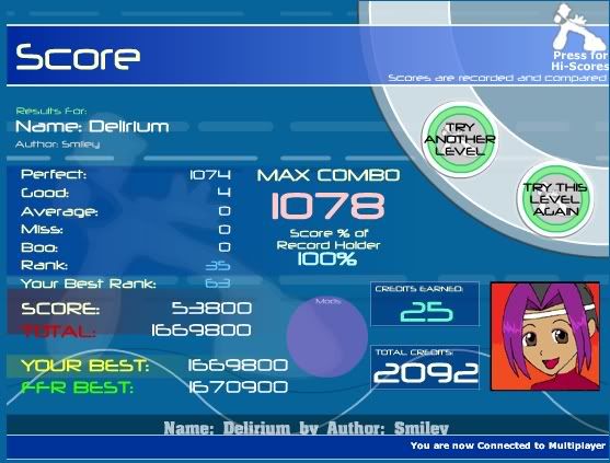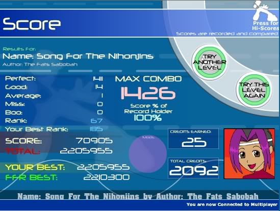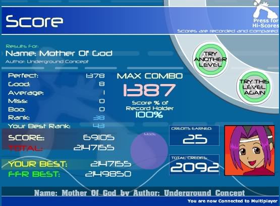 :![]() Was hurting my avg rank: ![]() ****ING FINALLY!: ![]() Deli was on my 3rd run on anything all day. Warmed up with an Etude to a Dragon AAA and I thought, hey, let's AAA some more Moogy stuff. Booed out after a run where I got a random good and then got that next run . My hands were shaking at the end because I've probably played that damned file a hundred times without a AAA.EDIT: Avg rank below 20 now, as well.