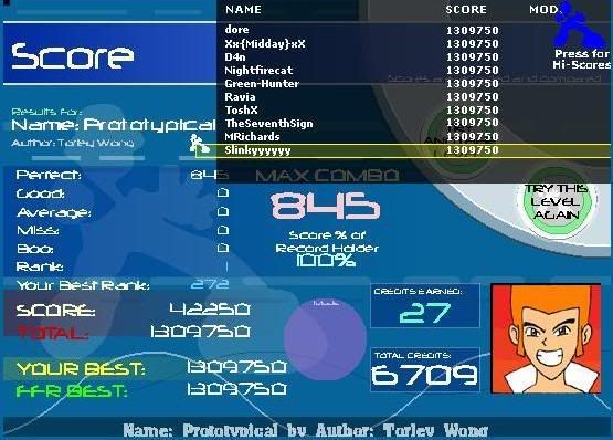 Damn I hate this song. I cant seem to like any songs with just blue arrows because then I just end up getting out of a tournament because of these fricken blue off beat arrows and I hate the backgroud to the song and the music. Horrible choice. Sorry for being late but I sure hope this gets me through cuz I need credits more then anyone here cuz all my credits are going to a tournament that I am doing and I will be left with nothing and so I hope that I can get atleast enough creds to play all the secret songs and Im done.Enough talk and here is my sucky score(How can people AAA this song).