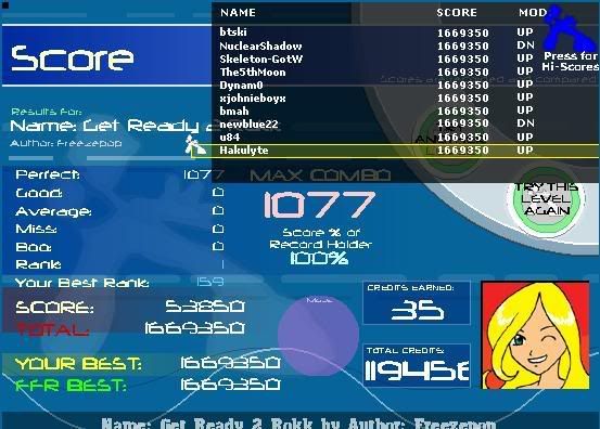 EDIT: I've posted Screenshots of the scores so far Players that have sent in a score so far: lumphoboextreme Loot You StepmaniaGod6969 lXD Rebirth0 HammyMcSquirrel newblue22 i love you paramountgymnst EskimoCarl Brothaice u84 Last edited by FrenzyMidget; 05-31-2007 at 05:01 PM.. |