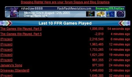 EDIT2: Alright here's my new score it was better than last too. ![]() EDIT3: Ok here is the boggle thing for the FP. ![]() Last edited by Kekeb; 08-9-2007 at 01:39 AM.. |