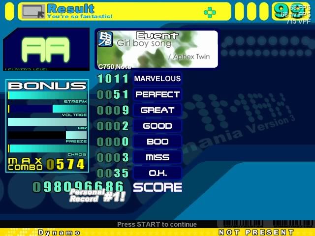ps nice SD Here's a score too ![]() Not my best MA (cuz my best MA run was ridiculous) but it's still sexy, and has decent CBs...so my PR#1 =) btw around the middle I was blue comboing for like 400 arrows it was freakin' nuts |
