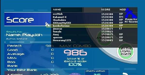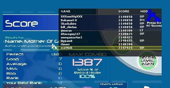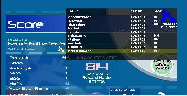 http://www.flashflashrevolution.com/...gameid=3278067 Improved my Thinking Different some more: http://www.flashflashrevolution.com/...gameid=3278040 Tied my Etude To a Dragon: http://www.flashflashrevolution.com/...gameid=3278310 I also got a 2 good CIA Rave but the person quit early so it's not showing up in the multiplayer game views and I didn't take a screenshot ...Then, afterwords, I finally FCed Nova Pulser. PA is terrible, but whatever. ![]()