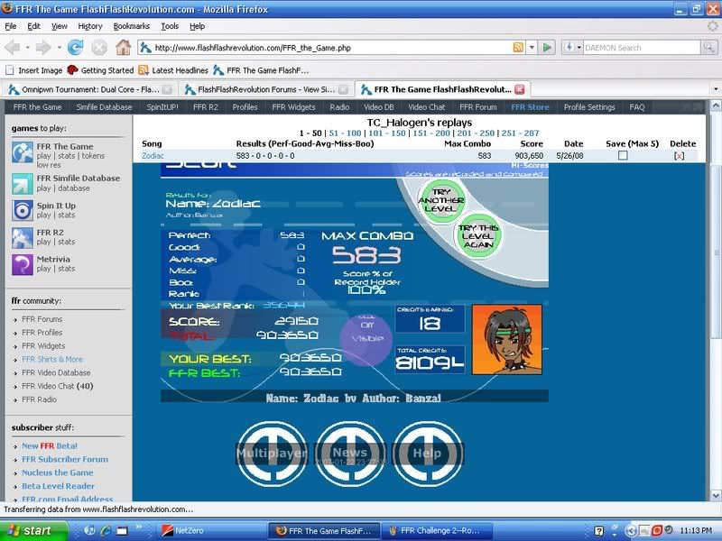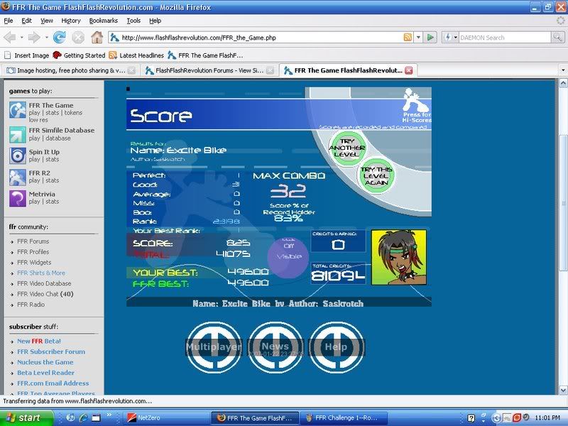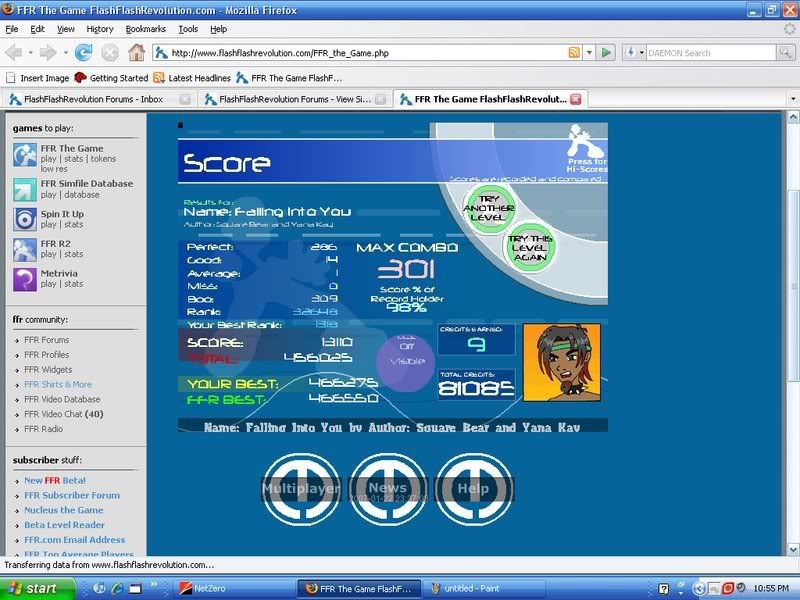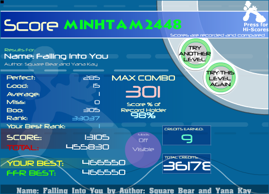 FFR Challenges Falling Into You Excite Bike (Gonna try to fix it ONE more time. Zodiac Twilight Techno (Tornado) Meh, these are pretty early scores, and seeing as how there is still time, I'm gonna try to fix those scores. I'm pretty sure with two flags (if the Excite Bike 1 perf/31 goods counts as a flag So, right now, I think that I have around 2,000 points, which is an OK start for someone who is probably going to end up relying on the FFR challenges later. ![]() EDIT: Rubix, you never told me if the mental SS's got through to your PMs. Did they? |