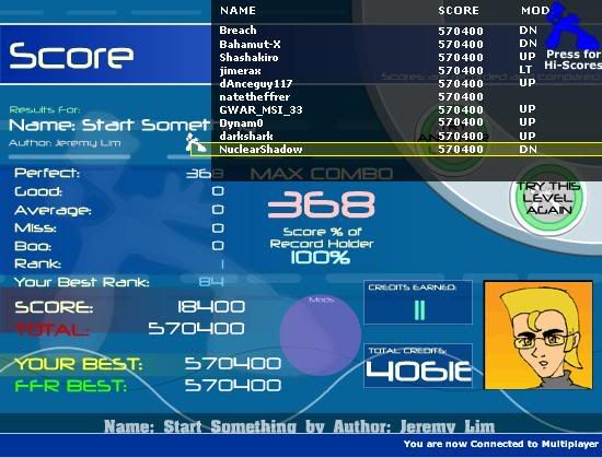 Raindrops Libertine Playdoh Life Goes On Burnout Blank Knowing La Luna Caida 8-Bit Day Dreamer Below the Surface She Bangs (William Hung Version) and these... ![]() ![]() ![]() ![]() Quite happy about that last one Also, not AAA but decent rank.... ![]() Average level rank: 86.66 EDIT: Just got Boss Machine as well EDIT2: ![]() Best before was 19 XD Last edited by diablic_minion; 09-3-2006 at 12:52 AM.. |