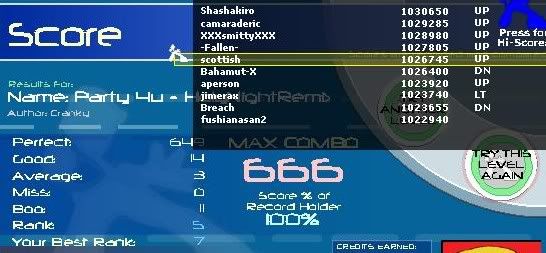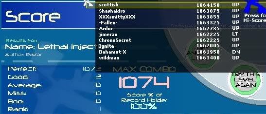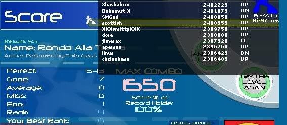 thanks shash, I had 34 goods on Aim and missed on the ending jacks once, my pa slowly declined after playing that song 10 times in a row...Thanks itmorr... Gj dore.. even though you knocked me off of N.O.F. I also just improved my rondo v1, to 7 goods 1 boo, which ranks me 4th on it... sorry no ss. |