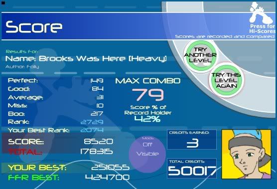 1st in Kommisar's 2009 SM Tournament 1st in I Love You`s 2009 New Year`s Tournament 3rd in EnR's Mashfest '08 tournament 5th in Phynx's Unofficial FFR Tournament 9th in D3 of the 2008-2009 4th Official FFR Tournament 10th in D5 of the 2010 5th Official FFR Tournament 10th in D6 of the 2011-2012 6th Official FFR Tournament FMO AAA Count: 71 FGO AAA Count: 10 Bluearrowll = The Canadian player who can not detect awkward patterns. If it's awkward for most people, it's normal for Terry. If the file is difficult but super straight forward, he has issues. If he's AAAing a FGO but then heard that his favorite Hockey team was losing by a point, Hockey > FFR PS: Cool AAA's Terry - I Love You An Alarm Clock's Haiku beep beep beep beep beep beep beep beep beep beep beep beep beep beep beep beep beep - ieatyourlvllol |