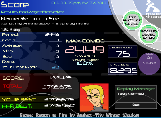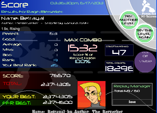 As for me, holy shit did I luck the patterns in this file near the end! Easily could have bagged goods, but somehow I squeezed by with an AAA! ![]() Improved!! I will AAA this someday... ![]() This was also wonderful to get out of my level ranks! ![]()