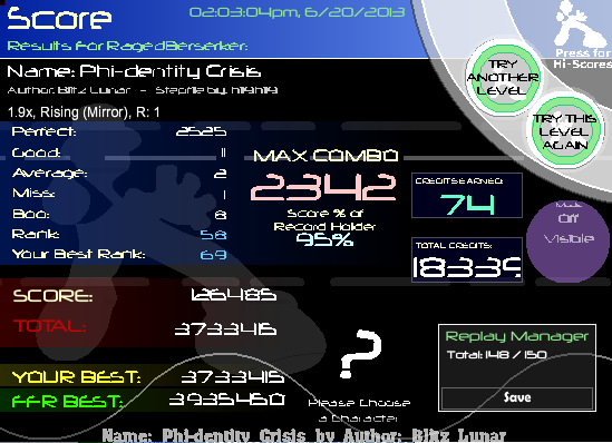 ![]() I can improve this also, but I dun think I will bother. ![]() Gaaah x.x this chart is super fun but also frustrating. I have yet to FC this. > > ![]() Meeeeeh. Wont bother with this one either lol. ![]() |