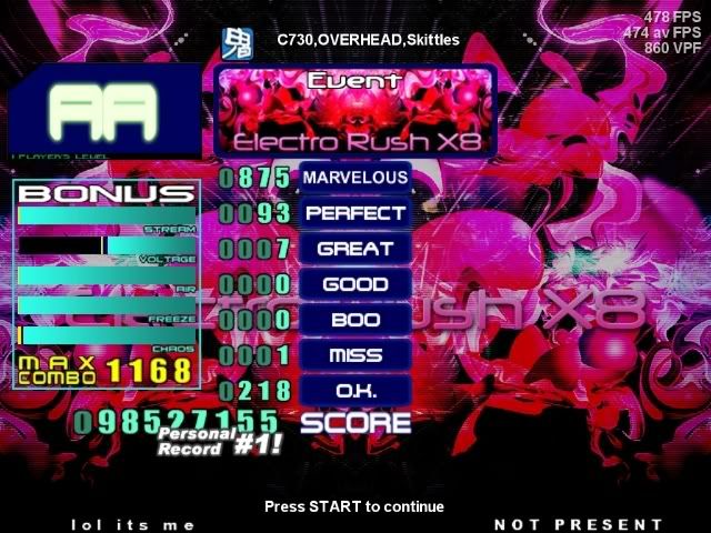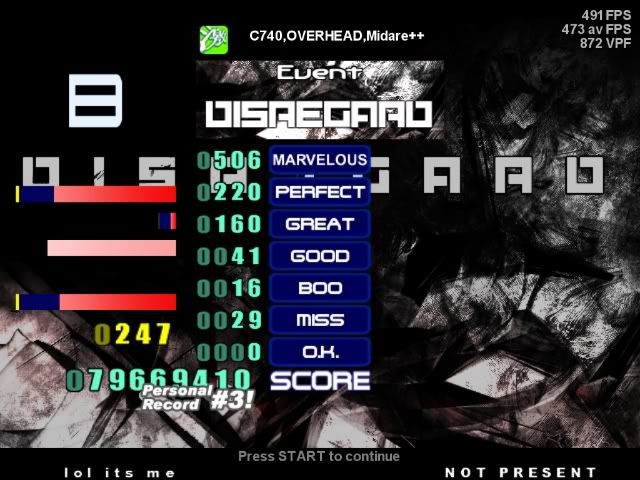 ![]() SIGHTREAD, BITCHES ![]() lol? second try ![]() This is okay or is it crap? ![]() Again, I'm REEEEEEEEALLY bad at this song so this is good for me ![]() lmfao ALL these greats and all misses but one were BS, this was my first game of the day so I wasn't warmed up at all. Can probably AAA ![]() lol why am I posting this, it proves I can mash and nothing else ![]() Also AA'd Shind Bad (the thick jumpstreamy one) but I don't feel like posting SS |
