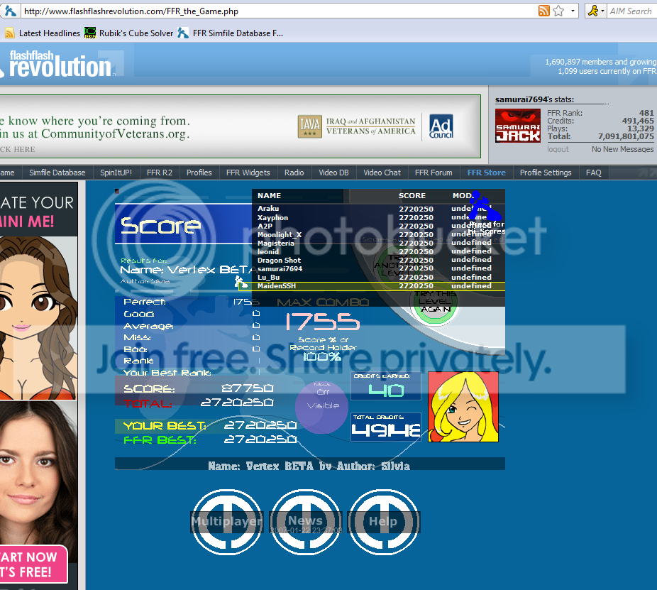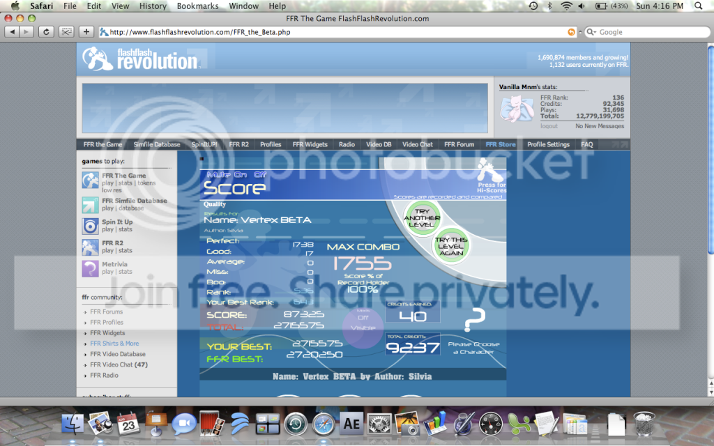 http://www.flashflashrevolution.com/...play/53166541/ There's the replay link, I suck =) Edit:// Here's a link to the screenshot ... it loaded on facebook but not here. http://www.facebook.com/photo.php?pi...c&id=606159718 Last edited by TheSaxRunner05; 08-23-2009 at 03:32 PM.. |