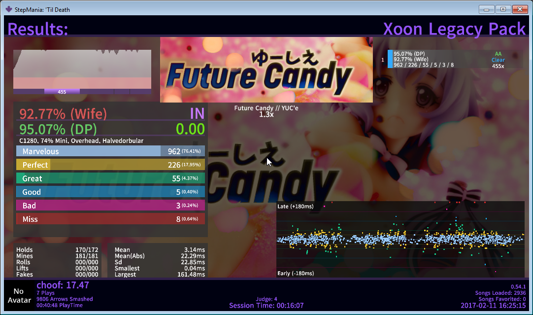 yo i'm bad now rofl. time to play again. wish i had more scores, but cpu died along with all my scores (and wips fuck) and most of the ss i have saved atm are of unreleased files so... here's the most recent notable one: fun file. has that kommi charm in it. ![]() |