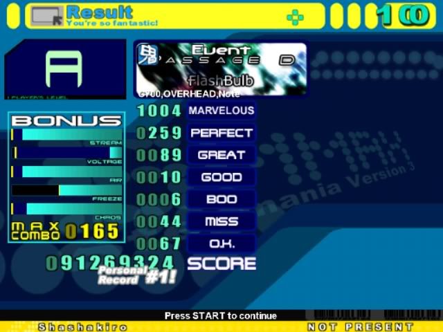 ![]() I've lost track of what's good anymore, this was first try in ages also like 48 perf 2 great 1 miss on strangeprogram which I didn't bother SS'ing, all the crap was on the one long left trill FFR has started to bore me, I might play more SM now