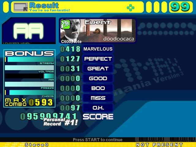 EDIT: OH MY GOD FINGERS ON FIRE!!!!! I WAS MOVING EXTREMELY FAST!! INSANE! ![]() ^One of my best scores of alltime. Last edited by TA_WReCKLeSS; 09-4-2006 at 01:54 AM.. |