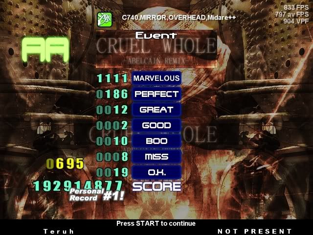 1st in Kommisar's 2009 SM Tournament 1st in I Love You`s 2009 New Year`s Tournament 3rd in EnR's Mashfest '08 tournament 5th in Phynx's Unofficial FFR Tournament 9th in D3 of the 2008-2009 4th Official FFR Tournament 10th in D5 of the 2010 5th Official FFR Tournament 10th in D6 of the 2011-2012 6th Official FFR Tournament FMO AAA Count: 71 FGO AAA Count: 10 Bluearrowll = The Canadian player who can not detect awkward patterns. If it's awkward for most people, it's normal for Terry. If the file is difficult but super straight forward, he has issues. If he's AAAing a FGO but then heard that his favorite Hockey team was losing by a point, Hockey > FFR PS: Cool AAA's Terry - I Love You An Alarm Clock's Haiku beep beep beep beep beep beep beep beep beep beep beep beep beep beep beep beep beep - ieatyourlvllol |