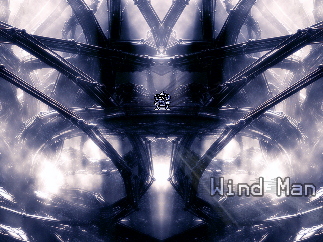 Those gfx are freaking sexy. I think I'd move the 8-bitness out of the center of the image and more towards the text though. It kind of takes away from the awesomeness of the lighting and the main image. Plus, there's already enough symmetry in the bg, a-symmetry with the text and 8-bit "wind-man" would work nicely to accent the rest of the gfx.