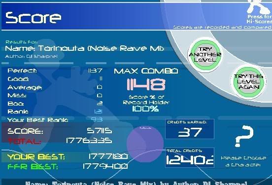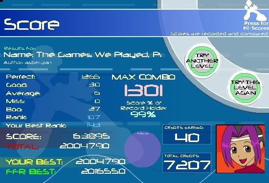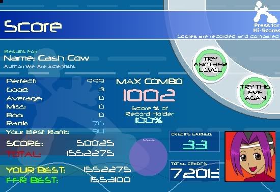 EDIT: this is the best i can do, sorry to disapoint ![]() all this on cash cow lol Username Games Total Perf Goods Avgs Miss Boos AAAs FCs Arrows Sweet_Feet 121 40,486,635 26050 247 26 82 230 1 8 26323 * i think that how it goes, AAA is "the world as we knot it" ![]() Last edited by Sweet_Feet; 08-22-2007 at 01:58 PM.. |
