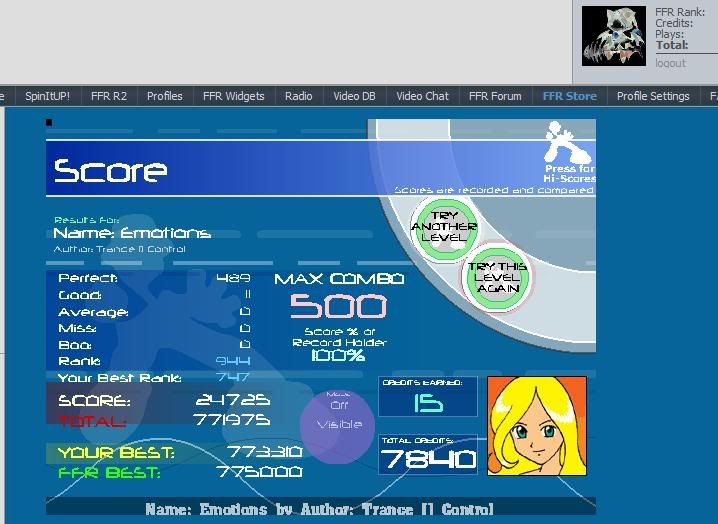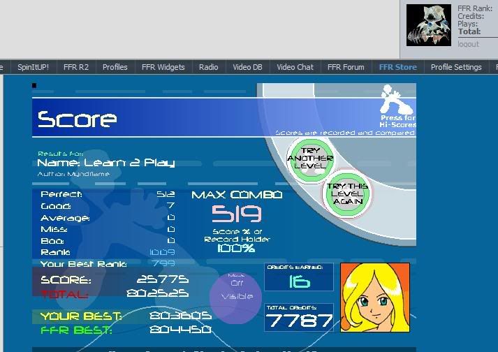 Damn, this isnt ****ing fair. FFR crashed on my computer and even though i do exactly what is says to fix it it does nothing. I know i can beat that score to. Damn, well congrats firefox