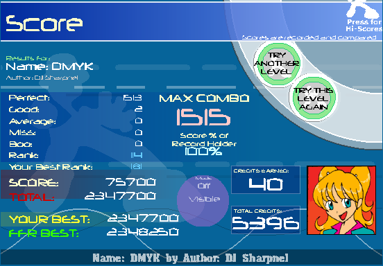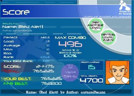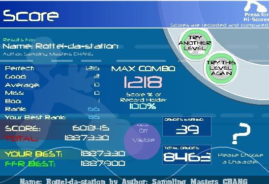 Well, I hate this song. xD a LOT. This is first try, then I tried again to improve, 10 goods, like 6 misses, 2-3 average, and like 20 boos. So that's not gonna happen; this is the best it's gonna get. -.-