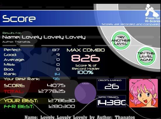![]() [My Profile] | [My Music] | [Play FFR] | [My Photobucket] | [My DeviantArt] AAAs: 210 (186+7+17) Best AAAs: Vertex BETA, Fighting for Control, Nova Pulser Recent AAAs: {Firestorm}, Dazzling Destiny, Hellbeat v2p 2nd place in 3rd Official Tournament 1st place in Jugglin/Jteh's 1st Tournament |