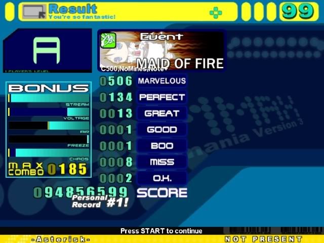 Red banner I have a 95 mil A as my best haha (have AA'd) but haven't played that in months in favour of green. My best maid of fire heavy score: ![]() Have FC'd with worse MA/PA. |