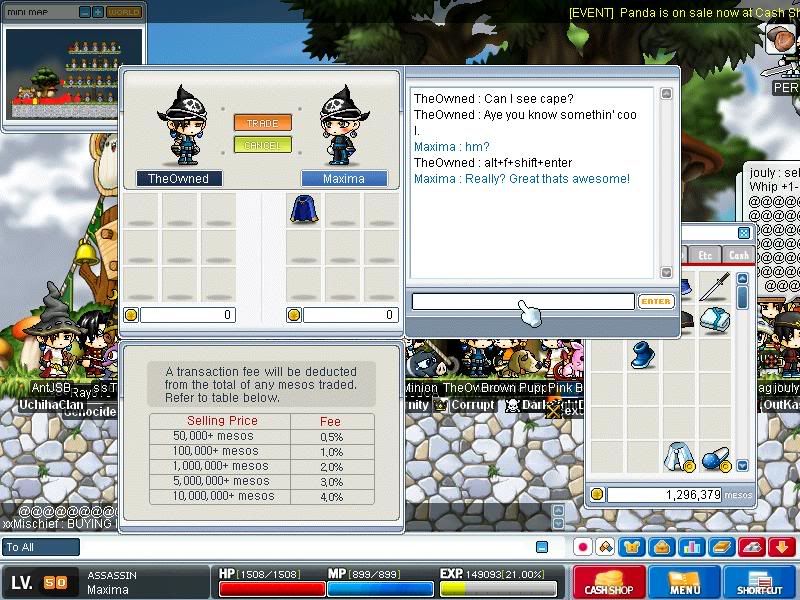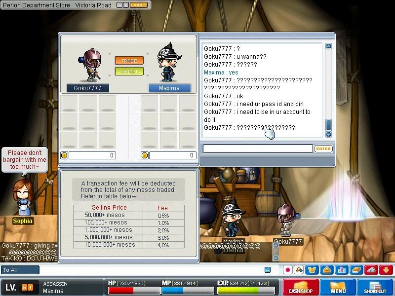 This guy asked me if I wanted free NX cash, I knew it was a scam before he even spoke, but I played along for a bit... ![]() This one, the dude tried to scam my newly aquired Icarus 2 cape.. ![]() and this one has nothing to do with scamming, but I thought that I'd throw it in to tell you guys that these are extremely difficult, took me forever to kill it, and I almost died like 4713647 times, was spamming potions almost the entire time. ![]()