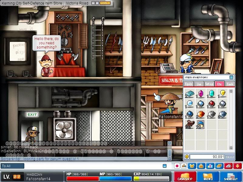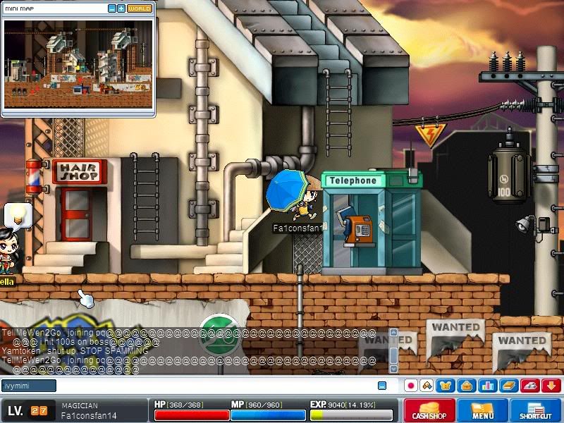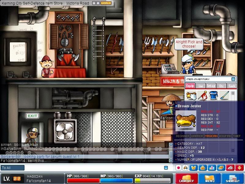 PS: Pics I never posted: Shoes only (screwing around before 2x): ![]() Somebody stumbled across our charades: ![]() BUT NOW, FOR ME AND CAM'S JMS MISHAP OF AN ADVENTURE: First, we get stuck in Ludi, and Cam can't leave because he's only level 8: ![]() So we take the elevator down the east tower in Ludi: ![]() And we wind up here once we reach the bottom: ![]() So we go through the portal at the bottom and wind up in Korean fairy tale land: ![]() Note the well to the left. I didn't realize it, but that's the entrance to Aquaroad. We explored a bit first, getting our asses kicked by tigers: ![]() ![]() But then we went down the well to Aquaroad: ![]() Made it to town: ![]() Took a wrong turn. x___x ![]() BUT FINALLY MADE IT TO ORBIS (right after seeing scupa pepes)! ![]() And from there, Cam transferred some money and bought a tower scroll and EQ items to get to level 10. I walked back and took the Ludi train (cuz I was po', foo'!). It was a rather fun adventure. =) There Cam, I posted the pictures finally. Quit harassing me about it now. =P PPS: falcon, I have a couple panlids I think. One is already 100%'d, and I think I have a clean 10def one somewhere...whisper me. XD