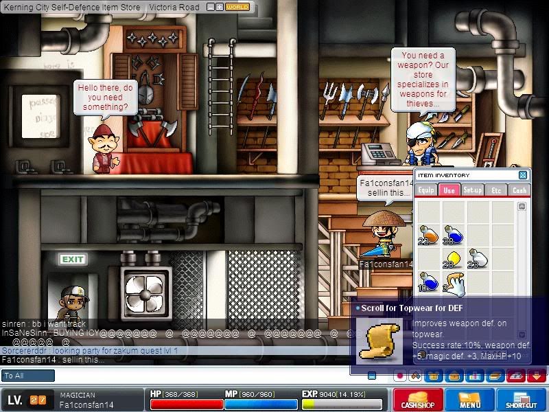 Oh I didn't buy a tower scroll because I was too poor. I bought a whole bunch of red pots and managed to make it up. I killed myself on the 11th floor because I didn't lose exp(beginner).