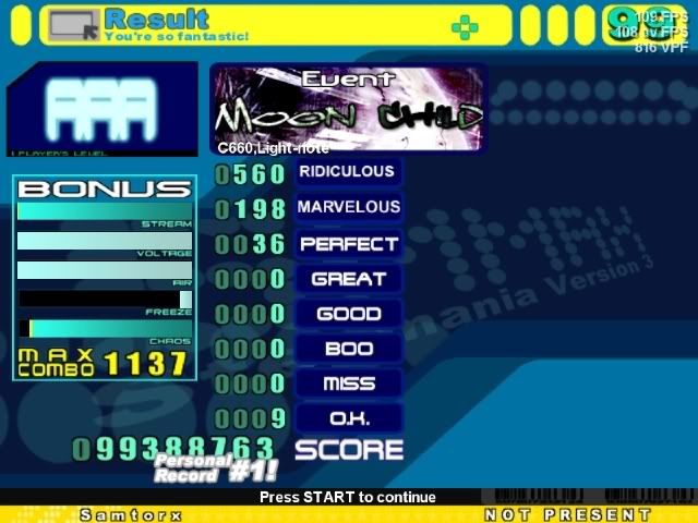 Turns out I play better on my regular installation of stepmania than on my online one. I don't know if it's the lack of scores on the right, which always seem to draw my attention when playing online and cause me to miss, or if it's the fact that I use 4.0 to play online, or if it's that I use a different theme and noteskin on my regular installation than online, or if I'm just imagining that these scores are better, but whatever.