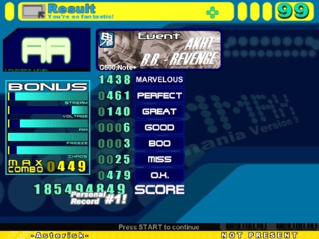 I lost a considerable amount of speed and precision. See for yourself... Sightread ![]() Sightread ![]() *barf* I liked the AG steps better ![]() I could have got 10 less perfs and 1 or 2 less greats, but my dad persisted to talk to me during the little streamy part at the end. |