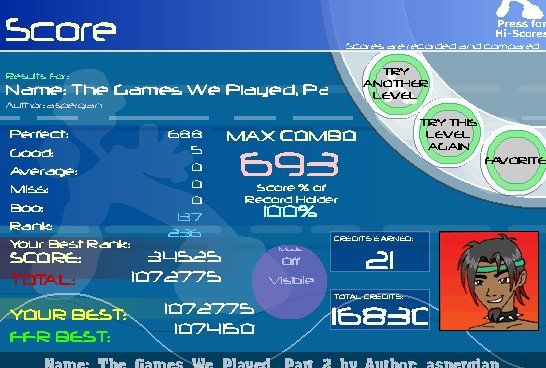 Removed a .gif image so your total signature size isn't well over 1MB. Keep this in mind for the future. 5th Official FFR Tournament Scores (Division 5) Round 1: Novo Mundo (AAA) Round 2: 4 Chord Touhou (AAA) Round 3: October (1.0.0.1) Round 4: Silly Symphony (1.0.0.0) Round 5: Hardkore Atomic (4.0.0.1) Round 6: Blue Rose (2.0.0.0) Round 7: La Dump (Eliminated for being lazy.) ![]() Quote: