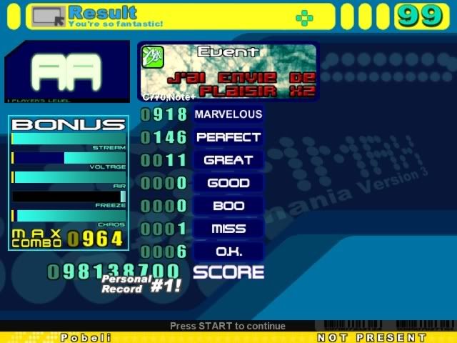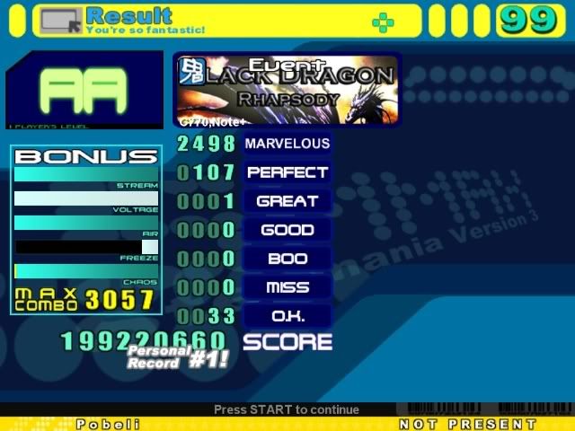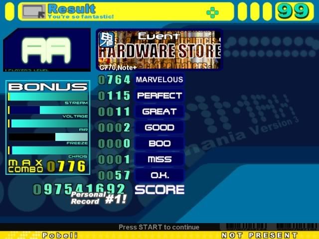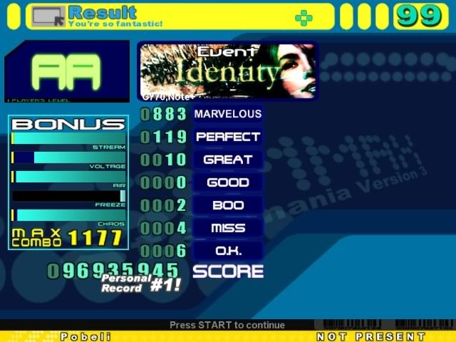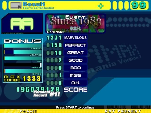 I don't know if my jackhammering technique is wrong, or if I'm just really bad at them, or what, but jackhammers are by far my weakest point.I might be able to AAA Identity if it weren't for that one 32nd trill, but I usually get greats in the other bursts too. I'd at least be able to FC it with around 5 greats, though, I think. As it is, I get around 8 greats and a similar number of combo breakers. EDIT: Played Identity a few times. Got 90 perfects, 7 greats, and 5 misses on 3 separate runs. This score is the highest machine score I could get out of small handful of tries, but it might not have been the best. Pretty sure I could do better than this, though. ![]() As for Trisection, I played it about 15 times, got past the beginning jacks about 5 times, PASSED twice, and got a grand total of 0 A's. ![]() EDIT2: OK, I played the other files too. Since 1983 wasn't too hard. My Kasta Sten from a few days ago is a tiny bit better than krazykhalid's, but not much. I doubt I'll ever beat that Trisection. Second try. ![]() And a few other scores. Posting for the accuracy, machine score, and combo. Completely messed up the beginning or this would have been ridiculous. CB's are kind of bad though. ![]() For me, this is an insane jackhammer score. But the song is 126 bpm, so they hardly even count as jackhammers. ![]() The jackhammers are by far the hardest part of this song for me. ![]() Last edited by Pobeli; 04-7-2007 at 11:11 PM.. |