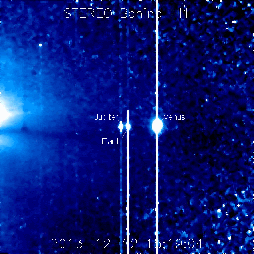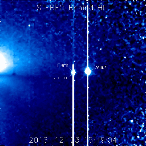 December 23, 2013 -With fall gone and winter here, the Great Square of Pegasus is again tipped up onto one corner after dinnertime, now descending on the western side of the sky. The main line of Andromeda's stars extends up from its top corner. -Big sunspot AR1928 is crackling with M-class solar flares. Magnetic fields spiraling away from the sunspot's location on the sun's western limb are well-connected to Earth, raising the possibility of a radiation storm around our planet if the flares intensify. NOAA forecasters estimate a 60% chance of M-class flares and a 10% chance of X-class flares on Dec. 23rd. -According to some scholars, the Star of Bethlehem might have been a close encounter between Venus and Jupiter. The two brightest planets in the night sky, merged, would have made a spectacle of Biblical proportions. This Christmas, NASA's STEREO-B probe is observing a conjunction of three planets-Venus, Earth and Jupiter. Unlike conjunctions of the distant past, this one includes our home planet. STEREO-B is located on the far side of the sun where it can look back and see Earth along with other worlds in the Solar System. Only NASA's twin STEREO probes, equipped with their high dynamic-range Heliospheric Imagers, can witness this kind of conjunction. From STEREO-B's point of view, Earth and Jupiter are less than 0.5 degrees apart, while all three planets fit in a circle 3 degrees in diameter. This meeting is not nearly as tight as the putative Star of Bethlehem conjunction ~2000 years ago. At that time Venus and Jupiter could have been as little as 6 arcseconds (0.00166 degrees) apart. Nevertheless, the ongoing conjunction is still a beauty. Stay tuned for updates as the three planets converge. ![]() Astro Picture of the Day: December 23, 2013 ![]() ![]() From a radiant point in the constellation of the Twins, the annual Geminid meteor shower rained down on planet Earth over the past few weeks. Recorded near the shower's peak over the night of December 13 and 14, the above skyscape captures Gemini's shooting stars in a four-hour composite from the dark skies of the Las Campanas Observatory in Chile. In the foreground the 2.5-meter du Pont Telescope is visible as well as the 1-meter SWOPE telescope. The skies beyond the meteors are highlighted by Jupiter, seen as the bright spot near the image center, the central band of our Milky Way Galaxy, seen vertically on the image left, and the pinkish Orion Nebula on the far left. Dust swept up from the orbit of active asteroid 3200 Phaethon, Gemini's meteors enter the atmosphere traveling at about 22 kilometers per second.