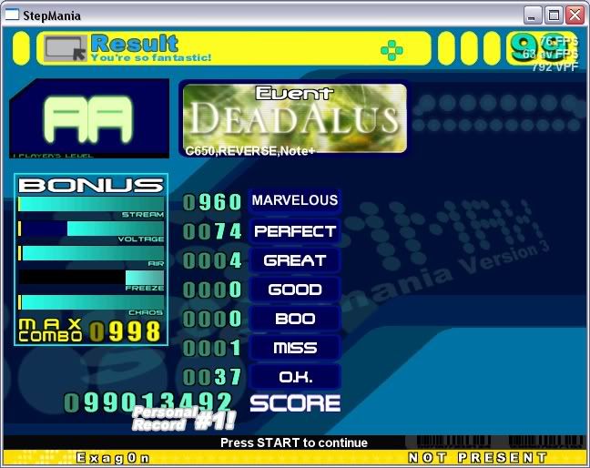 ![]() First AA...I'm bad at mashing the trills I guess haha, AAAd the running men at the start tho ![]() Retarded score, both perfs in one random section of 32nd bursts ![]() Gahhh =( for people who don't have that, the max combo is 2000+ and there are only 1200ish judgements...so thats alot of hands and jumps hehe |