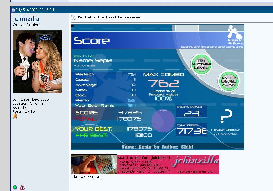 _____________________________________________ AAA - 189 Level rank Average Level - ? Best legit. FC - Runnymorning (SGX Mix) ITG Overall % - 97.60(not updating anymore) ___________________________________ Winner of HammyMcSquirrel's tournament Winner of rshadow8888's tournament Winner of travman301's tournament Winner of Colt.45's tournament |