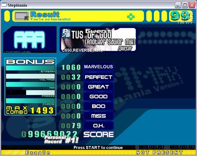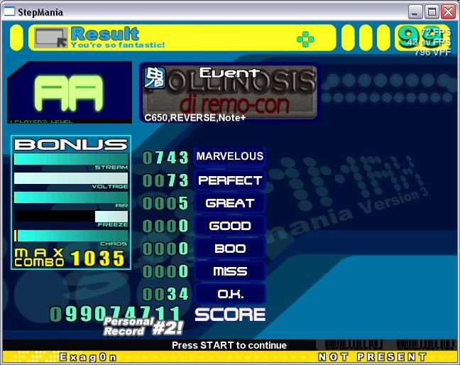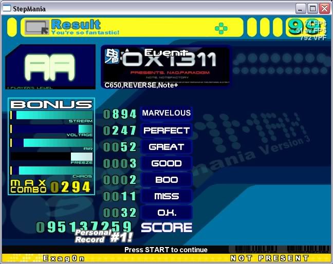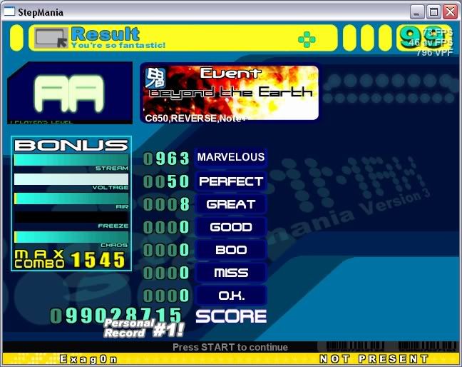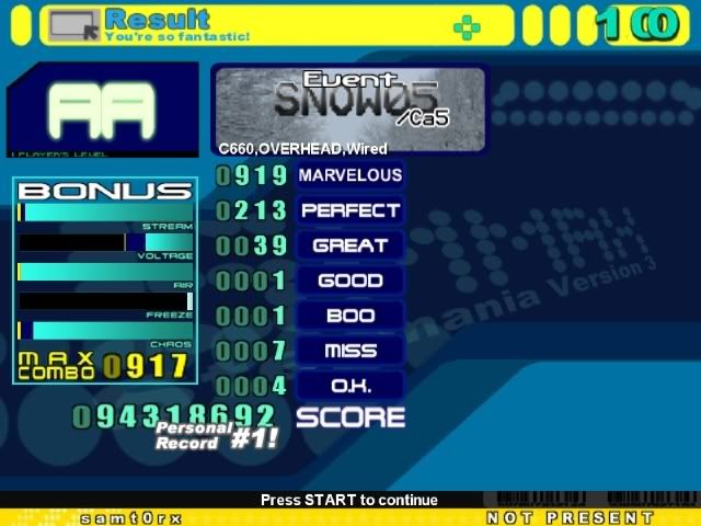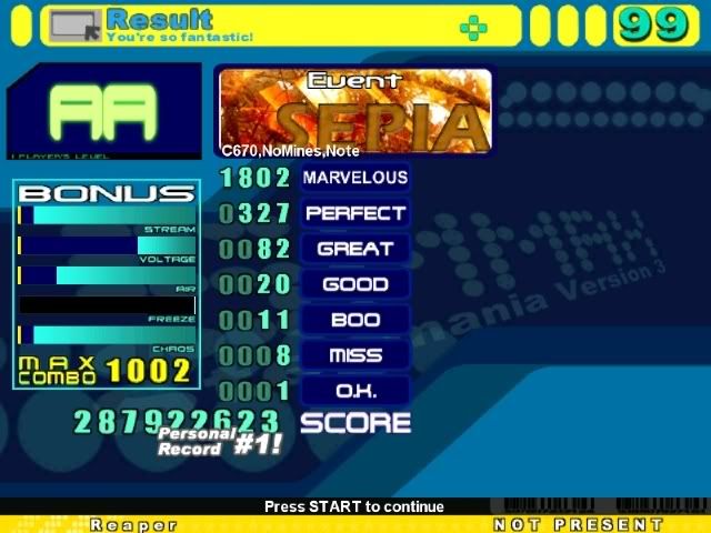 I took a few days break because I was doing crap while playing. Got a couple of improvements tonight: Another million improvement ![]() For the combo ![]() For everything else ![]() If I could nail one part then I could get a 1400-1500 combo on this. All at the end. Knew my sightread could be improved ![]() 1.6% from AA. Will AA next time I play all the way through this. |