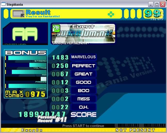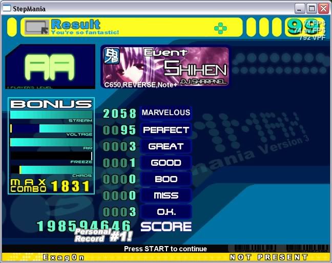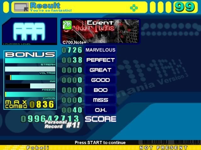 I can't beat that menthe score though. That score is incredible baha. ![]() Edit: I've been playing NVLM's red sign constantly lately and I'm pretty sure 195 is possible. I can combo the ending now, but it seems to require a bit of luck because of the minijacks. I also played blueplanet a bunch of times and 93+ is probably possible. I have no idea what thoar is getting right now, but I got a massive (150+) combo in the stream at the end the other day. It involves SO MUCH LUCK though >_< Too bad I'm getting a tad bored with sm again because I seem to be plateauing again, other than little improvements on certain songs. I don't think I can get any faster...I think increases in scores from this point only come through improved techniques on specific songs.