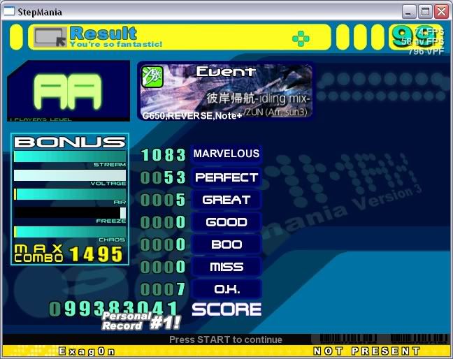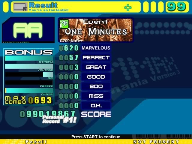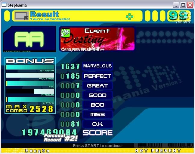 Combo is the most meaningless thing ever. If you want to emphasize not missing, then you could make low CB's important and give large deductions for missing. The combo though in itself is meaningless and ffr really has to change its scoring system =/ I'm pretty sure I missed like 1-2 in the easy part which is why the combo is low. I'm really bad at holding freezing and hittings notes and I always have been. I can't do it in o2jam for the life of me...
