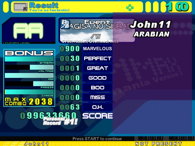 ![]() I don't know how and why but it felt really easy, strange considering i haven't played it for so long . I might be able to cut it down to 20 perfs. I'll try and manage that until my next post.Also got a good MA score on this ![]() It's not as sick as your score John, but I thought it was still pretty good (If you ignore the great and the miss which were totally random early in the file ). |