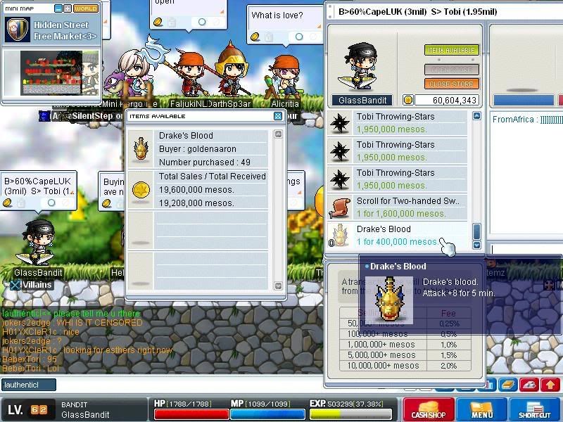 ![]() Anyways, defeated Zakum twice last night. First run leveling a friend to 140. He's a WK. Note the white exp meaning I got the last hit on the arm. ![]() Defeat with El Zakum (2nd gen). You can see the hacker with the bone helm on. He went straight for the DS then pretended he stole a helm. Though, he just had it hidden in his inventory. He didn't get the DS. I FJ'd right to it but a warrior friend got it first. ![]() GM visit... ![]() Defeat with Trinity (1st gen). lilosuiki looted the metus and then a helm. It was her first time going... She lied about the helm but gave back the metus. I had frapped it and so did another. We always frap the end. Yep, clear as day that she looted. Here's the video itself. ![]() *The one from last week netted me 46.5m in the end. *The first one won't really net me anything... It's a 95 atk ds. So maybe 1m after it's all split. *The second one netted me 4.76m from the sponsored (100m) helm buyer. There is also a 93 atk metus and a 45 atk caster. So probably another 17m. Post costs for each run is around 1m. So all and all Zakum has made me 66-67m in the past 3 runs. ![]() Oh and this... Finally... ![]() Last edited by banditcom; 12-3-2006 at 04:55 PM.. |