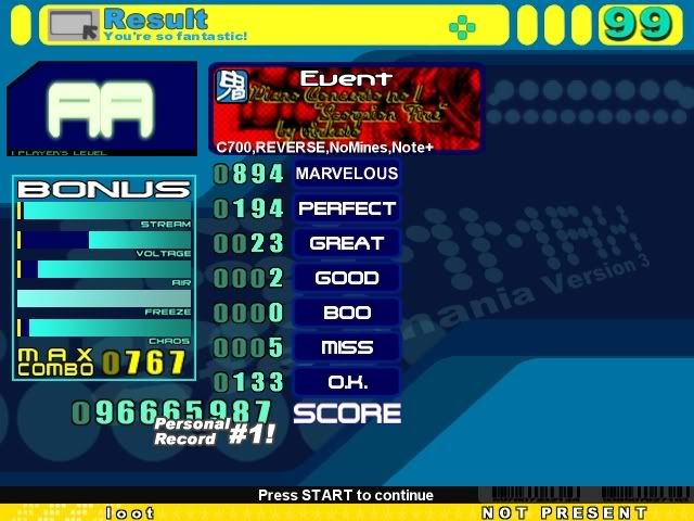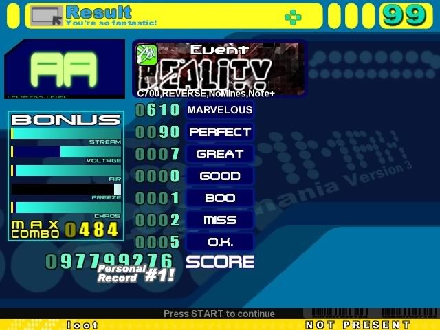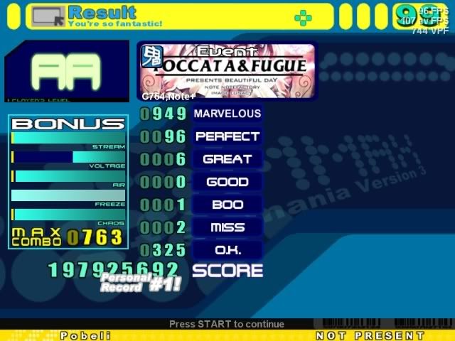 1 in the first jumpstream, 1 right after it, 1 at about 700 combo, missed the annoying 32nd burst at 997 combo and might have gotten a perfect or two there as well, got the rest of the perfects and the great in the end jumpstream.