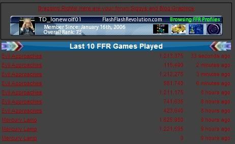 I simply can't AAA songs...it's so weird, it's like goods appear randomly...I mean, Im a good musician and scored an average A+ for rythm on music school...plus, I showed the lowest deviation from perfect rythm in beats while tapping it on a sensitive pad for a longitudinal neuro-psychlogical study...the fact that every FFR song or different arrows in the same song even are synced just slightly differently...maybe only like .04 secs off, pisses me off big time...maybe I should turn off the sound and AAA songs visually, but that's no fun...I follow the exact rythm of a song and if I get goods anyway, I can't help it. Anyway, here's my crap score on the song for this round...I probably should do it some more to get a better try.