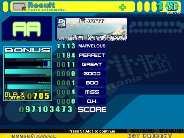 , the rolls are nearly impossible for me to do well on so I usually end up with a really terrible score like 50/20. The others look good too but I haven't tried them on rates, destiny is possibly the worst of the scores.So I've barely played Stepmania for the past week and I lost all my speed , played some MA stuff and the only decent score I could get was this:![]() I might be able to halve the perfects on a really good run since most of them are random, 1 or 2 perfs would probably be impossible though. Other than that I got 5 perfects on You are which should have been 2 since I messed up near the ending ![]() |