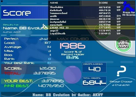 ![]() Wow.. I can't believe I FC'd this. It was insane, my arms were shaking for a few minutes after the song. Also, rank 4? I don't think I deserve it. -.- Last edited by arelik; 04-8-2007 at 07:01 PM.. |