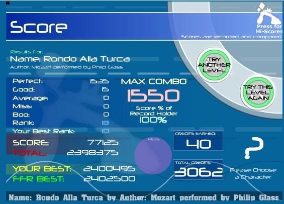 First FC. This isn't too hard to PA. ![]() First SDG. Pretty easy to FC, but a bit harder to PA than Rose. ![]() First FC I think. Could probably do better on this. ![]() First try today... best combo I've managed on it. I have a really hard time reading hard stuff on FFR. ![]() Best combo, tied for best number of goods, not sure about the rest. This could probably be better too, but I have a hard time reading hard things. ![]() |