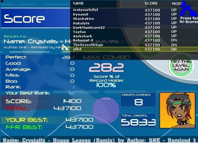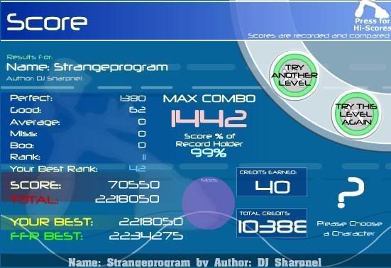 ![]() I have better but only pic I have of fc lol. ![]() Cant seem to AAA this =/ ![]() This song is lame happy I never have to play it again lol. Last edited by TK_Sage; 04-26-2007 at 04:24 PM.. |